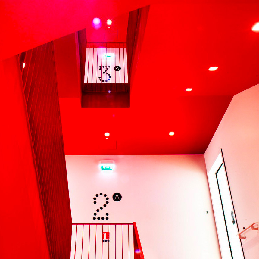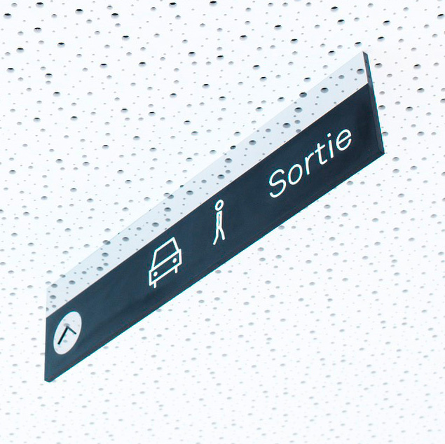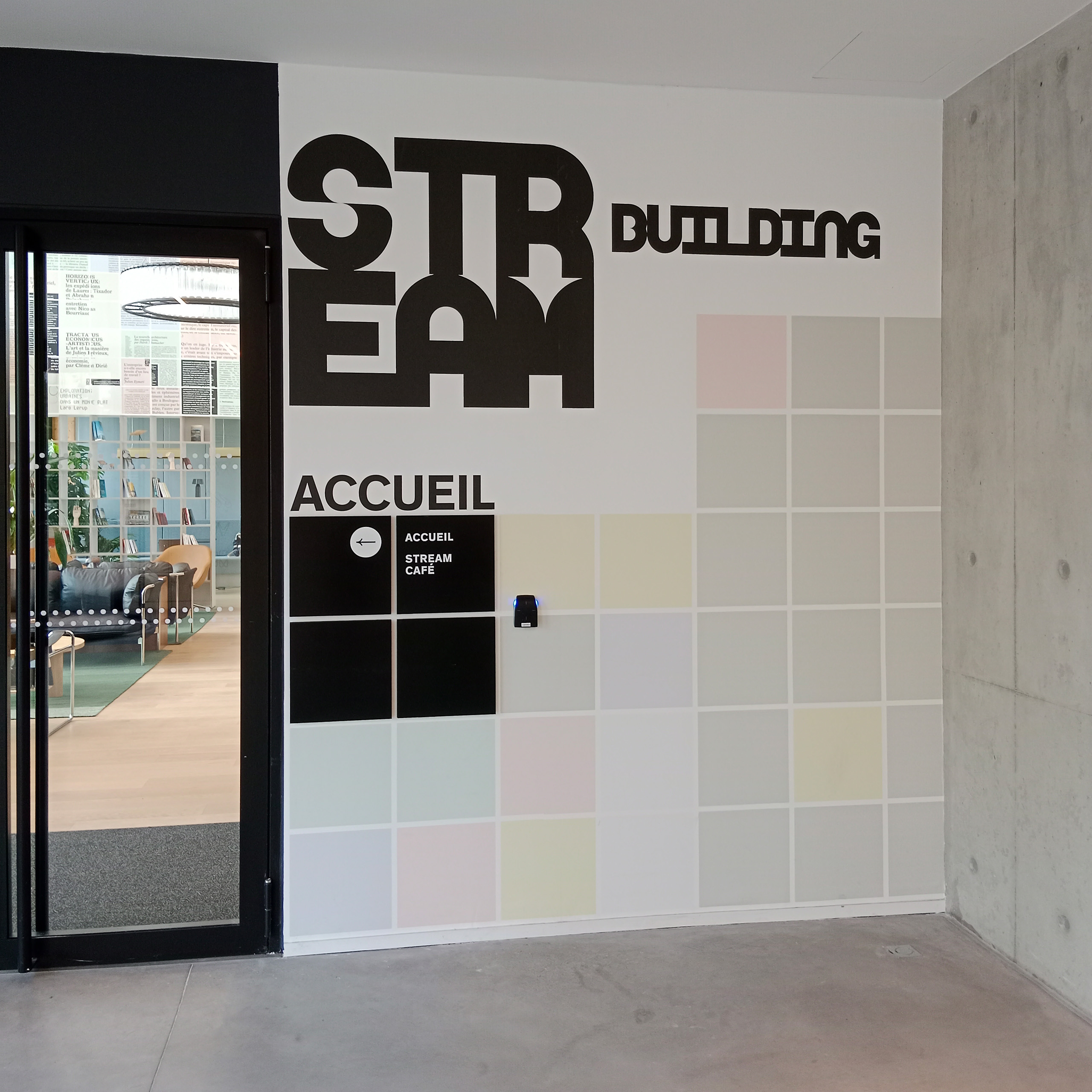 Conception et réalisation de la signalétique du bâtiment et du parking. Nous avons développé une identité graphique autour du point, déclinée en typographie et pictogrammes au traitement ludique.