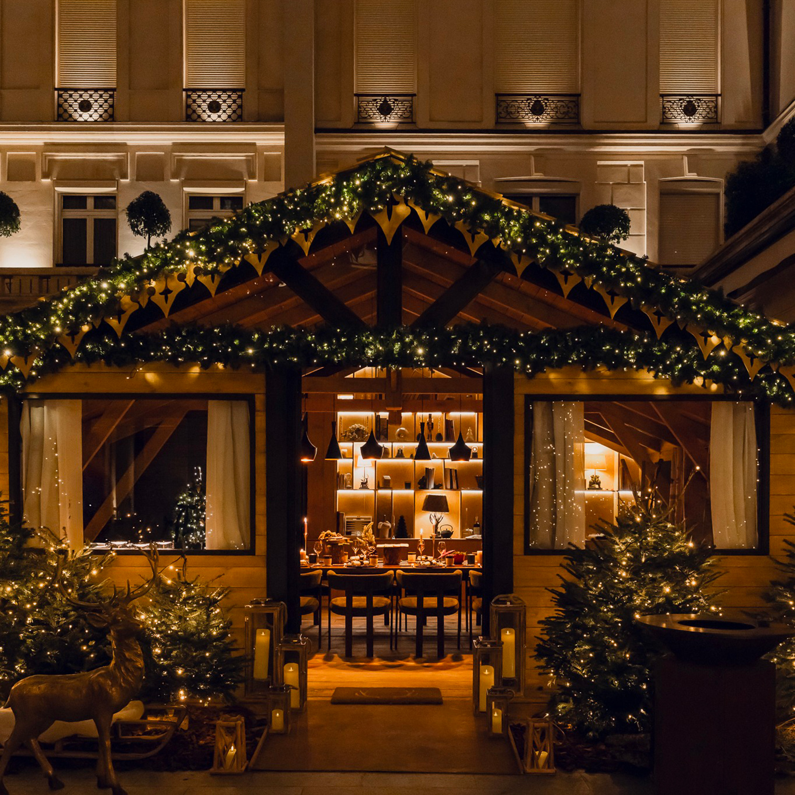 Nous avons conçu et réalisé un chalet éphémère au Park Hyatt Vendôme à Paris, alliant matériaux authentiques et ambiance soignée, avec une offre gastronomique signée Jean-François Rouquette.