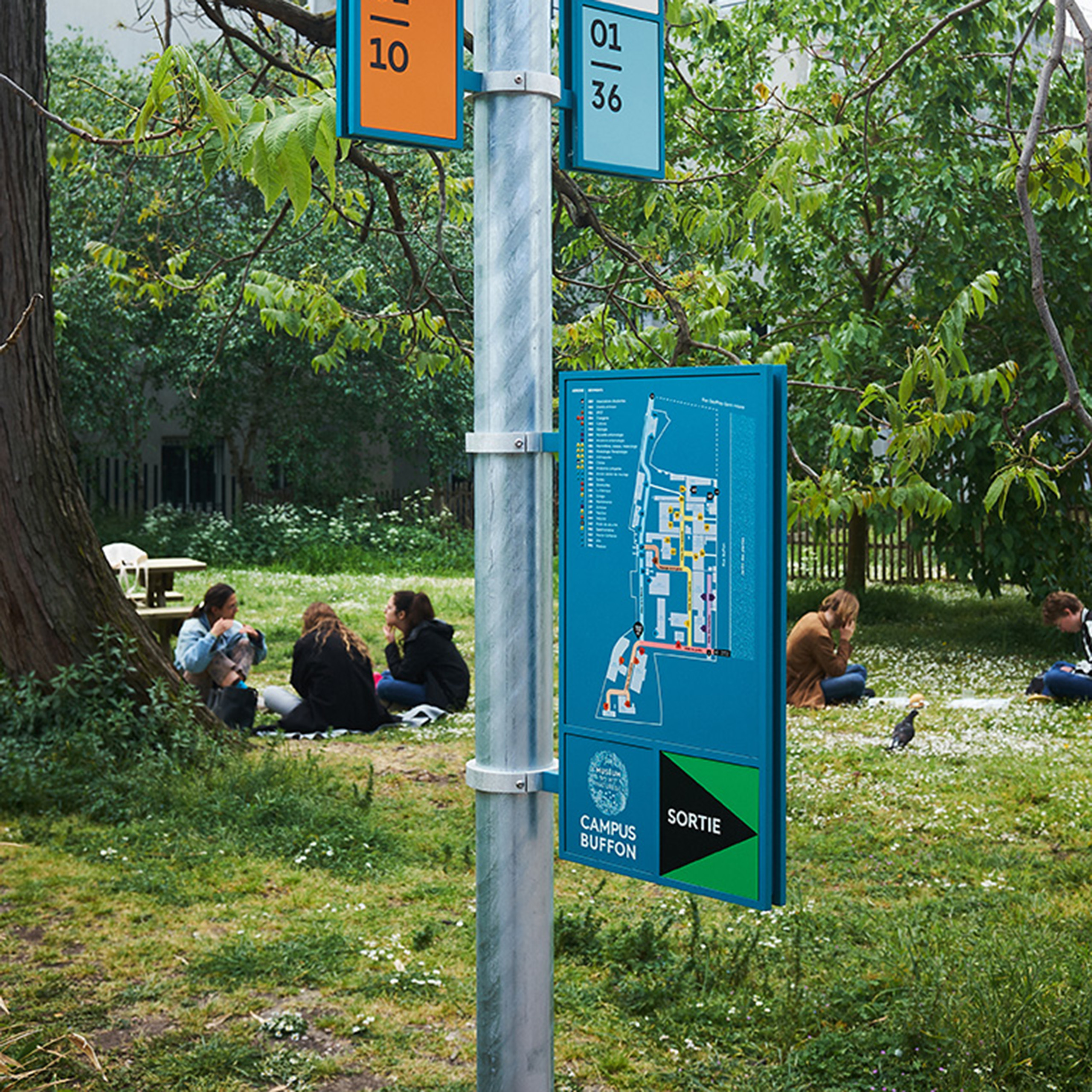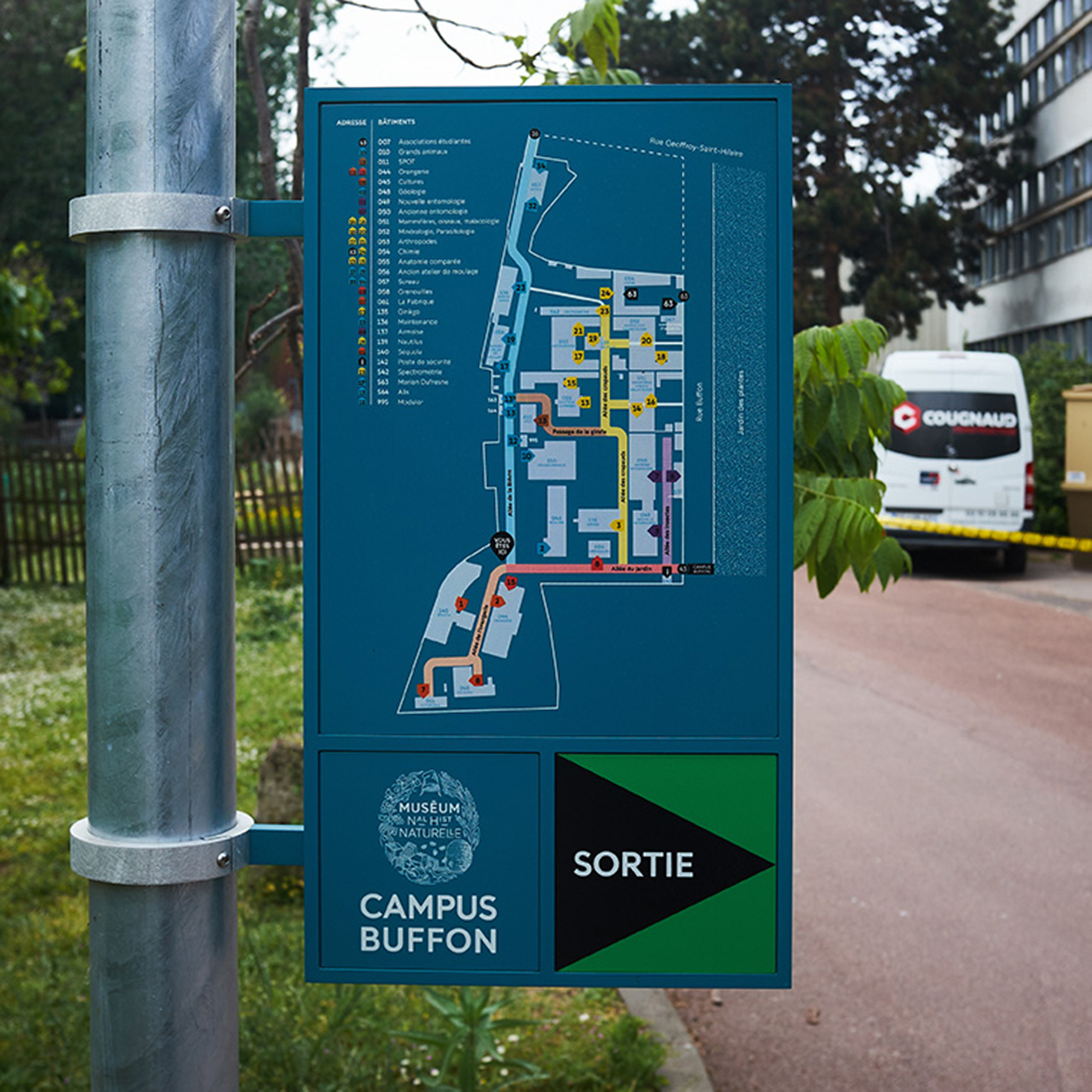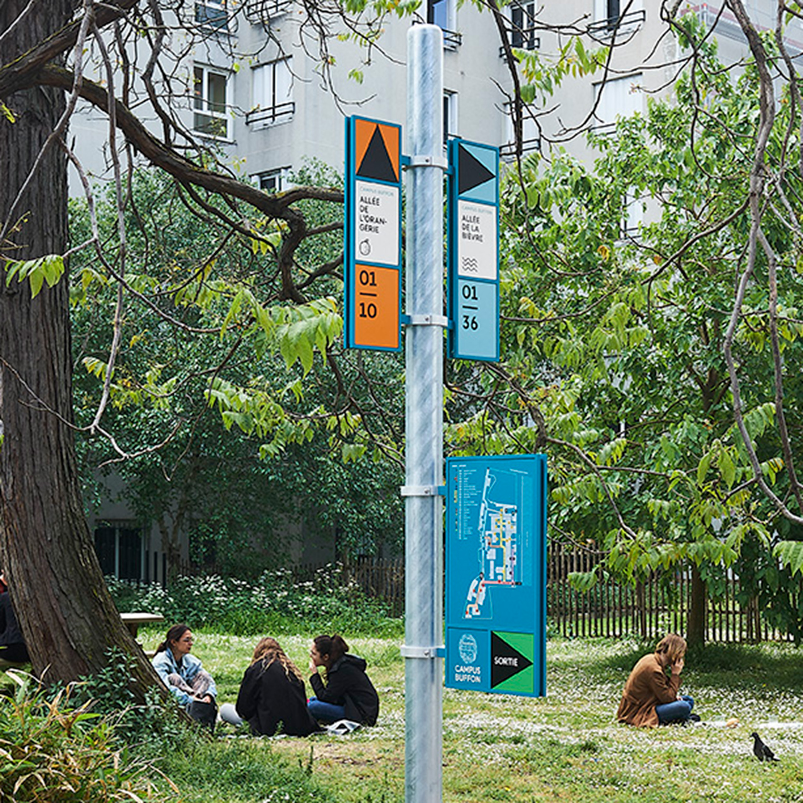 Nous avons conçu la signalétique du Campus Buffon, intégrée au site, modulaire et durable, déclinée selon les usages et l’accessibilité.